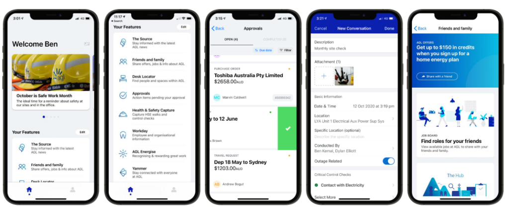 In June 2019, AGL launched PT3 (People, Process and Performance Transformation), their initiative to unite all AGL sites across corporate and group operations into one technical platform. It also aimed at delivering greater mobility and enabling AGL staff to work flexibly with mobile applications on their phone or tablet. After a first launch, however, user feedback showed the need to further improve the solution and explore ways to better enable employees digitally. AGL decided to examine their employees’ user experience (UX) to ensure a better adoption of the new platform. Clear focus of the new solution should be consolidation and ease of use. After a complete redesign of their mobile interface, AGL wanted to extend the great relationship they already had with their customers also to the people who worked for them, their employees.